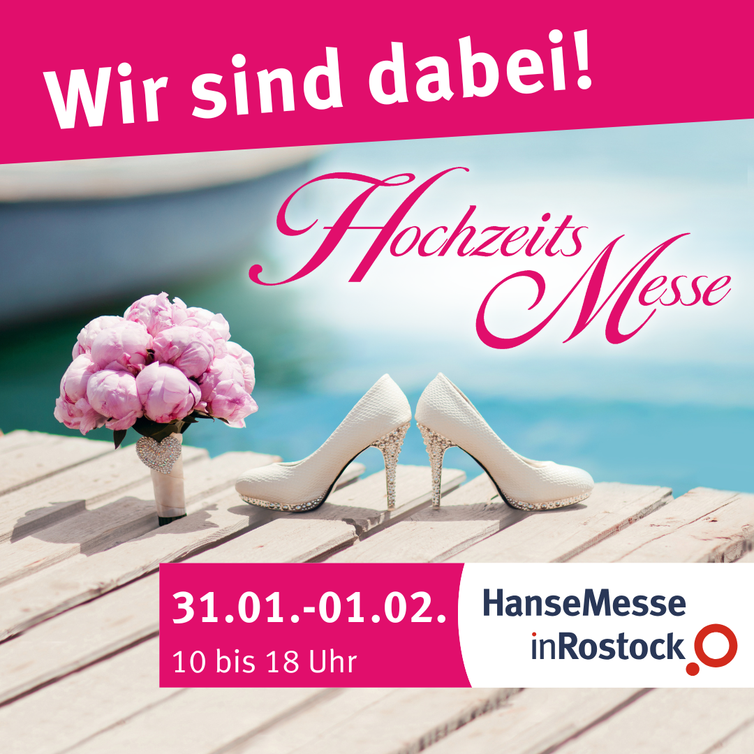 Bei der Hochzeitsmesse 2026 in Rostock begrüßen wir Euch liebend gern am Samstag, den 31. Januar und Sonntag, den 1. Februar von jeweils 10:00 bis 18:00 Uhr bei uns am Stand 404.